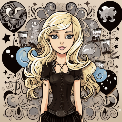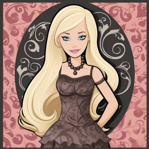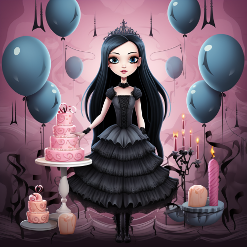 Illustration, 7 year old birthday invitation, blonde barbie wearing addams family clothing, paisley print, 3d animation, vector art, --v 5.2