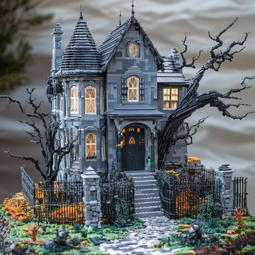 The Addams Family Mansion as big as Hogwarts built in LEGO by Tim Burton. tilting askew angles. creepy vibes. Halloweetown vibes. Stop Motion photography.
