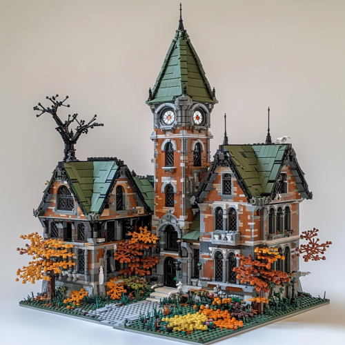 the three buildings of Tim Burton Victorian School Campus LEGO built multiple sprawling victorian school mansions built in LEGO by Tim Burton. tilting tower. Hogwarts vibes. tilting askew angles. creepy vibes. Addams Family mansion vibes. Halloweetown vibes. Jack Skellington vibes.
