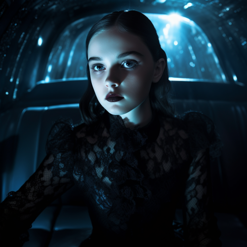 Wednesday Addams drives the Batmobile, Gotham city, spooky, creepy, dynamic lighting, beautiful, spiderwebs