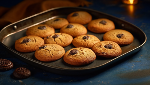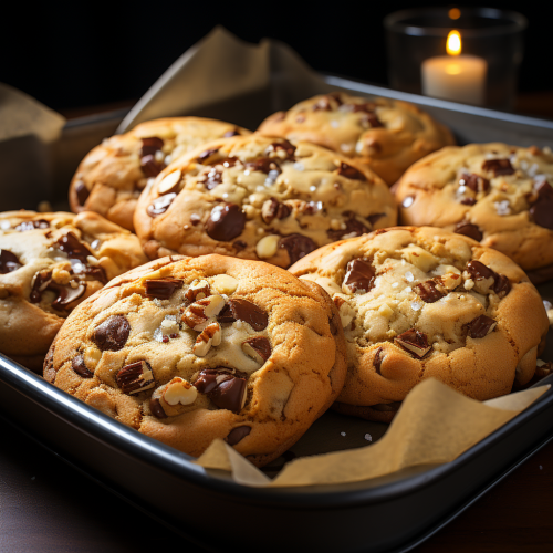 freshly baked cookies in a flat pan, separately packed, plain background, hyper realistic image, 8k image, canon r5, super sharp details, realistic photo --ar 7:4 --v 5.1 --s 750