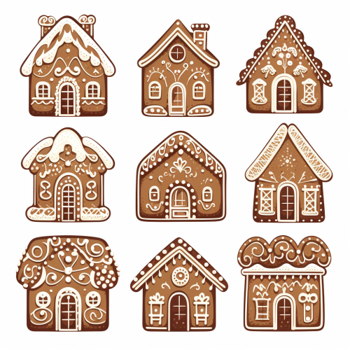 Gingerbread house. Set of vector hand drawn gingerbread houses. Christmas cookies. Brown and white colors on white background