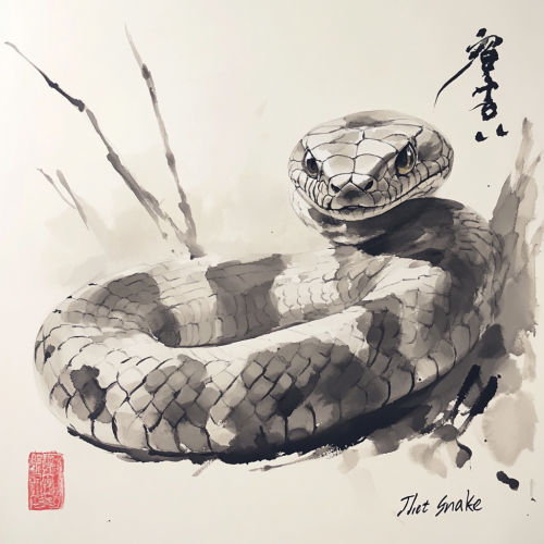 "The Quiet Snake": A snake curled in a restful position with a few subtle ink washes, emphasizing tranquility and introspection. Use minimal brushstrokes to capture the snake’s calm presence --v 6.1