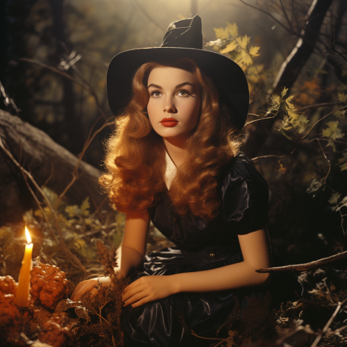 1950s color photo, beautiful witch in pointy hat, long wavy hair pointy hat, sat in a sunlight meadow in the wood, wild baby animals sat with her, sparkle, glimmer, dusk glow , --s 250