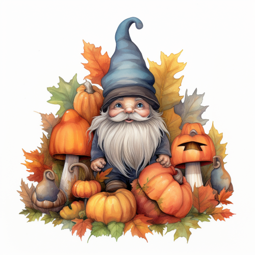 cute gnome, hat down over the eyes, surrounded by pumpkins and fall foliage, watercolor, no background