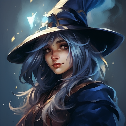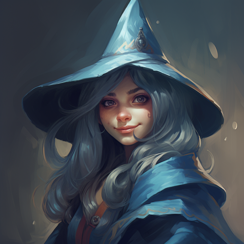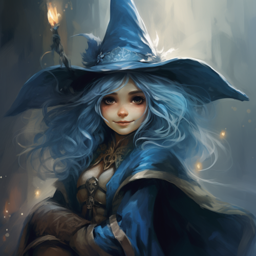 a female gnome, mage, blue hair, robes, pointy hat, mischievous smirk, fantasy art
