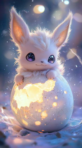 Chibi-style baby Eevee emerging from a large, cracked egg, with soft pastel colors and a dreamy, whimsical background. The egg has glowing patterns, and Eevee looks curious and cute, with big sparkling eyes and fluffy fur. Light reflections and soft shadows add to the magical atmosphere. 8k, HDR, High quality, --ar 9:16