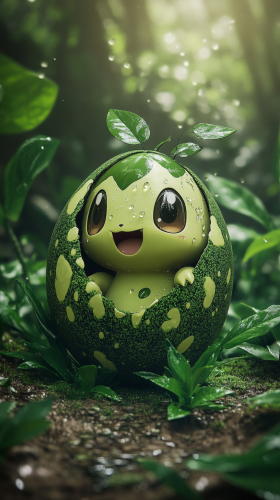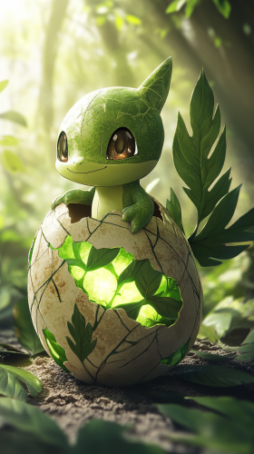 Ultra-cute chibi-style baby Treecko from pokemon emerging from a large, cracked egg with leaf and vine patterns. The cracks glow softly with a green light, and Treecko looks irresistibly adorable with its tiny, leafy tail and big, expressive eyes. The background features a vibrant, lush forest with oversized leaves and gentle rays of sunlight filtering through the trees. 8K, HDR, high quality, --ar 9:16