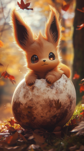 Chibi-style baby Eevee emerging from a soft, fur-textured egg. The egg has a subtle glow, and Eevee looks curious and playful, with its big fluffy tail and wide sparkling eyes. The background is a warm, autumn forest with colorful leaves gently falling. 8K, HDR, high quality, --ar 9:16