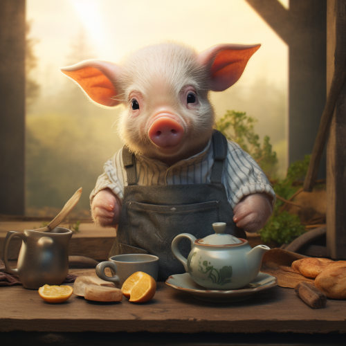 A charming scene of a cute baby pig eating a meal in a cozy home, inspired by the whimsical style of Hayao Miyazaki. The baby pig is sitting at a small wooden table, happily munching on its food, with big, round eyes and a joyful expression. The room is warm and inviting, filled with soft light, rustic furniture, and nature-inspired details like plants and wooden beams. The soft colors and detailed textures give the scene a magical, peaceful atmosphere, capturing the gentle, heartwarming spirit of Miyazaki's films. --ar 16:9 --stylize 150 --v 6.0