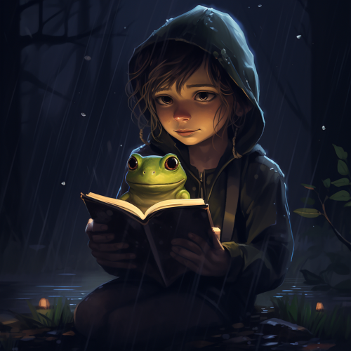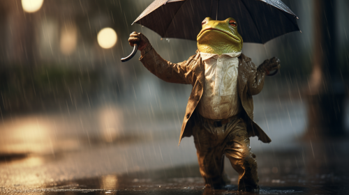 in heavy rain, on a road. A frog dance in heavy rain. professional and hyper realistic photo --ar 16:9
