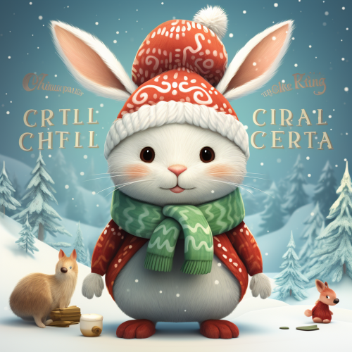 A Christmas storybook cover with the title "Christmas of a Little Rabbit" in fun. The illustration shows a cute smiling rabbit in a winter hat and scarf surrounded by holiday decorations. Children's book style.