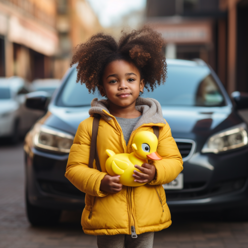 adorable black girl with afro pigtails is holding a rubber duck outside a minivan in an urban setting