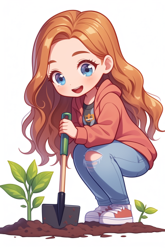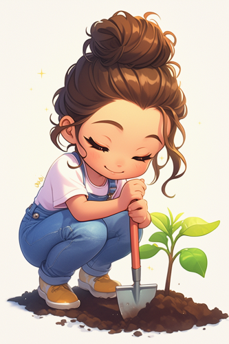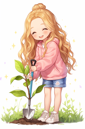 A cute girl very fashion kawaii chibi trowel in hand, tilling soil for young plants, eyes closed, smiling brightly, looking at tree, full body, in the style of kawaii chibi style, Long waves and Top knot, jean hiphop, shirt, elegant shoes, beautiful big face, sweet and smiling features posing and fashion show style thomas kinkade Nadja Baxter Anne Stokes nancy noel, against a white background, clear background separation, digital art in the style of Anna Dittmann, using digital art techniques such as marker illustrations, ink washes, and hand-drawn elements, adorable digital illustration, highly detailed, 2d, kawaii, flat --ar 2:3 --niji 6