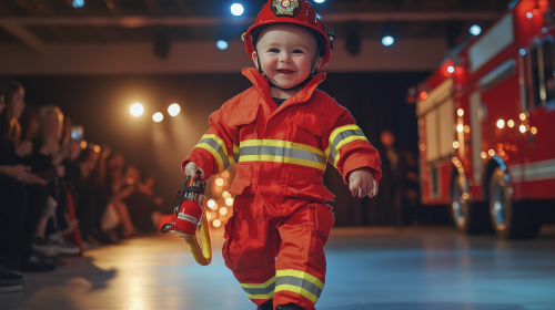 A super cute baby with a beaming smile, walking confidently on a runway, perfect for a TikTok aesthetic, dressed in a tiny firefighter’s uniform. The outfit features a bright red jacket with reflective stripes, tiny matching pants, and a small firefighter helmet. The baby is holding a miniature fire hose in one hand, and a small toy fire extinguisher in the other, symbolizing the tools of a firefighter. The baby is seen in a full-body view from head to toe, smiling joyfully, embodying the brave and heroic spirit of a firefighter. The background is set like a contemporary fashion show, with warm, glowing lights and a fire truck in the backdrop, emphasizing the firefighting theme. The audience on both sides of the runway is captivated, smiling and taking photos, impressed by the baby’s firefighter-inspired look, complete with essential firefighting tools. --ar 16:9