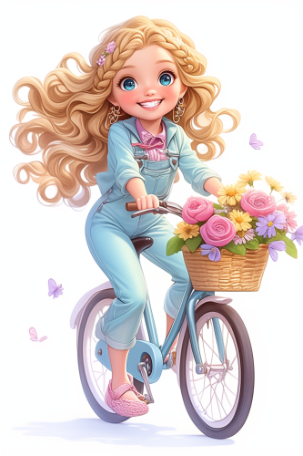 A cute girl very fashion kawaii chibi riding a bicycle and smiling brightly, with flowers on the basket, looking straight ahead, full body, in the style of kawaii chibi style, Waterfall braid hair, dynamic, ,lightblue suit overalls jacket shoes all in color waterpink, beautiful big face, sweet and smiling features posing and fashion show style thomas kinkade Nadja Baxter Anne Stokes nancy noel, against a white background, clear background separation, digital art in the style of Anna Dittmann, using digital art techniques such as marker illustrations, ink washes, and hand-drawn elements, adorable digital illustration, highly detailed, 2d, kawaii, flat --ar 2:3 --niji 6