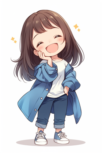 A cute girl very fashion kawaii chibi one hand lazily supporting one cheek, eyes closed, smiling brightly, face upturned to the sky, full body, in the style of kawaii chibi style, straight hair with bangs, jean, t shirt, jacket falls off one shoulder, shoes all in blue color, beautiful big face, sweet and smiling features posing and fashion show style thomas kinkade Nadja Baxter Anne Stokes nancy noel, against a white background, clear background separation, digital art in the style of Anna Dittmann, using digital art techniques such as marker illustrations, ink washes, and hand-drawn elements, adorable digital illustration, highly detailed, 2d, kawaii, flat --ar 2:3 --niji 6