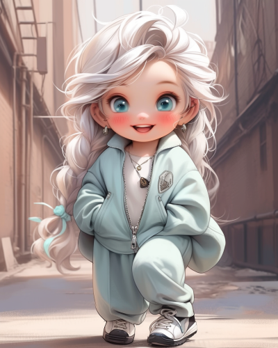 a beautiful little girl very fashion kawaii chibi Anna Dittmann style pastel blue suit overalls jacket shoes all in color silver beautiful big face and beautiful sweet and smiling features posing and fashion show style thomas kinkade Nadja Baxter Anne Stokes nancy noel --ar 4:5 --niji 5