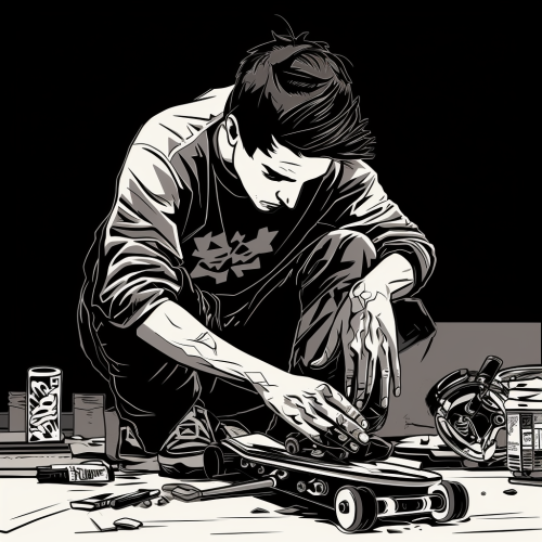 black and white vector graphic, simple detail, pop art inspired, repairing skateboard, skateboard repair service, anime