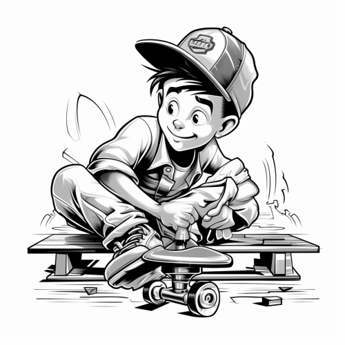 black and white vector graphic, simple detail, cartoon art inspired, repairing skateboard, skateboard repair service, cartoon character