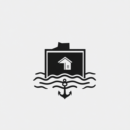 Create a minimalist logo in black and white featuring a cardboard box floating on water. The box should have a simple anchor image on its surface, and inside the box, include a basic silhouette of a house. Use minimal lines to achieve a clean, straightforward design, ensuring the elements are easily recognizable and effectively convey the theme of maritime organization and decluttering.