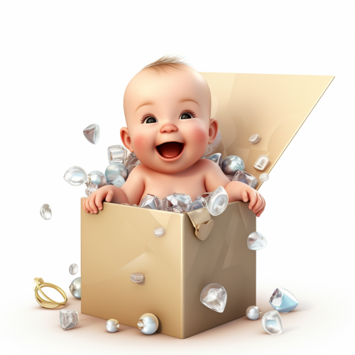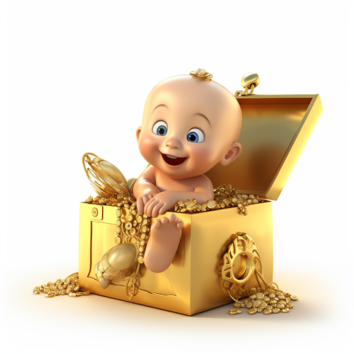 animated 3d baby sitting inside a cardboard box holding jewels and valuable gold inside the box grinning. white background, in the style of Eric Guillon --s 50