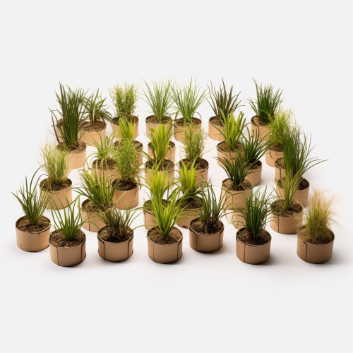 36 individual California native grass plants in round cardboard containers all placed in a flat corrugated box shot on white seamless background 4k, super hi-res
