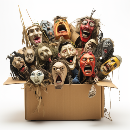 a cardboard box full of marionettes, on white background, --ar 1:1