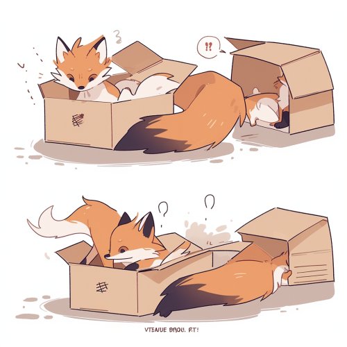Comic about a fox inside a box as if it were a carton store selling things --niji 5 --style expressive