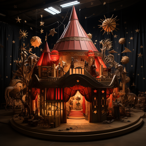 circus tent, made from cardboardboxes, night, cardboard box sideshows --s 750