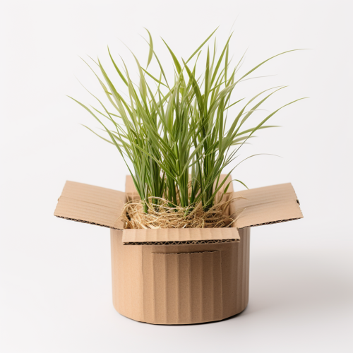 single California native grass plant in round cardboard container all placed in a flat corrugated box shot on white seamless background 4k, super hi-res
