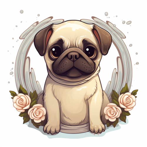 Adorable kawaii Full body pug Dog ultra cute with angels wings and a wreath of flowers on his head, vector, white background