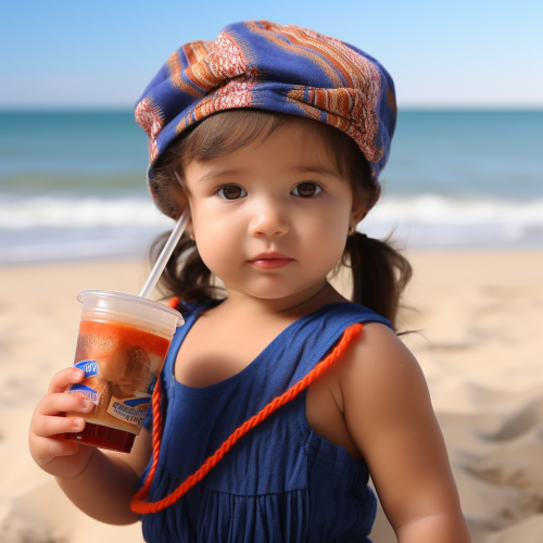 a realistic photo of a baby girl dressed as a hula dancer on the beach. She is drinking a doctor pepper and an iced coffee. She is wearing a New York Mets baseball hat.