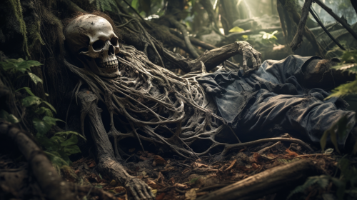 a skeleton, lying amidst some tree roots in the jungle. It is wearing what used to be fine clothing, but they are tattered now, chewed on by who knows what. photorealistic, highly detailed, --ar 16:9