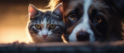Dog and cat together peeking out of a blanket, sharp, detailed, copy space --ar 16:9