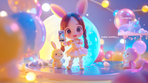 Cute girl character of a "Chinese zodiac bunny" Popmart blind box, holographic gradient color scheme, colorful background, full-body portrait, front view, high-definition details, 3D rendering, OC renderer, chibi style. she is taking a photo in the moon. --ar 16:9 --v 6.1