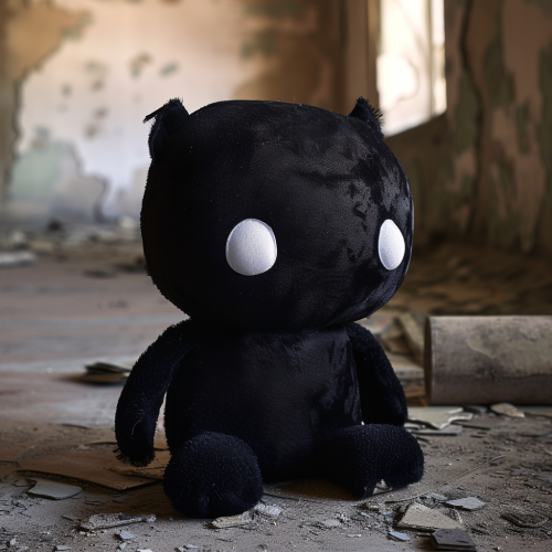Product photo of kawaii cute shadow creature plush toy made of black crystal super soft fabric with cute white eyes. Background is abandoned and decaying bedroom. Tags: kawaii, plushy, cute, soft --v 6.0