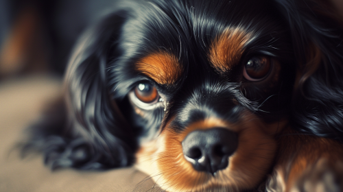 A realistic photo of a dog sitting, looking at the camera, captured with a Sony A7R IV and a 35mm f/1.8 lens, shallow depth of field to blur the background slightly, asymmetrical composition with the dog slightly off-center, soft natural lighting, muted color tones --style raw --v 6.1