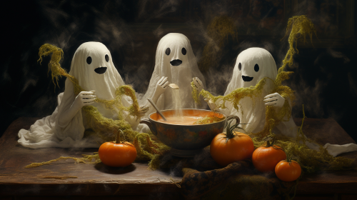 halloween ghosts eating rice and beans with carrot using oil-painted textures --upbeta --ar 16:9