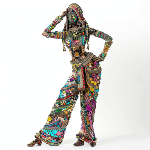 full body life sized sculpture of a woman made entirely of brightly colored colorful enamel, she is covered in colorful gemstones, Berber jewelry inspired, highly ornate and detailed, high definition product photography shot