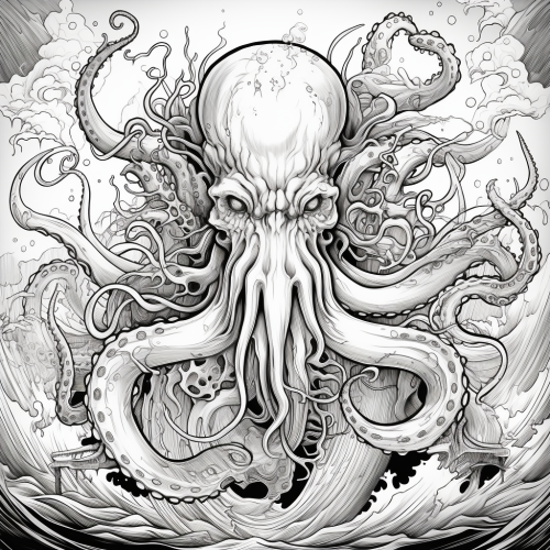 adult coloring book page--line drawing ONLY, no shading, black and white, outlines only, thick lines, beautiful, complex. Subject: the mythical Kraken