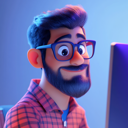 3d pixar themed of a hispanic guy that is happpy and content with working on a computer. he is looking at the screen. make the guy look between the ages of 27 and 33. he has a clean cut beard. use color thoery. vibrant colors. clarity. suitable for vectorization. --v 6.1