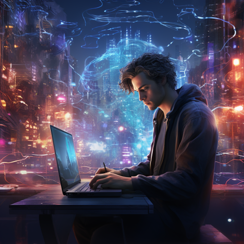A man sitting at their desk, with an animated brain glowing above them as they work on the computer. Award-winning photography, realistic in the style of photography. --ar 59:99 --s 250