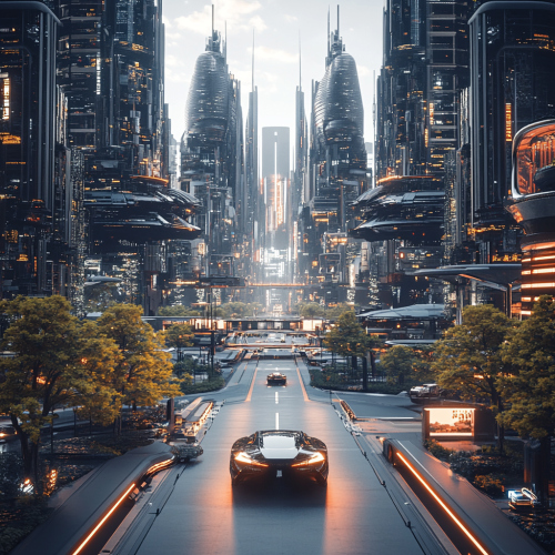 A modern city with wide, futuristic asphalt roads. The cityscape features tall, sleek skyscrapers, advanced architecture, and smooth, flowing roads that stretch across the urban environment. The streets are wide and clean, lined with innovative infrastructure, and illuminated with futuristic streetlights. The atmosphere is vibrant, showcasing a blend of advanced technology and modern urban planning. --v 6.1 --s 250