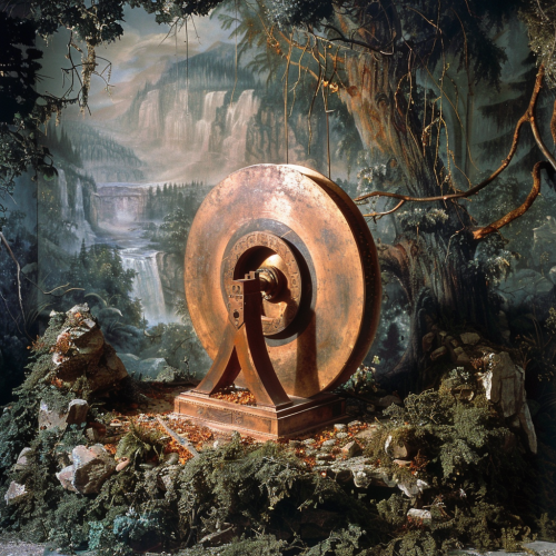 a copper age wheel on a sinegle axel machine, prehistoric scene