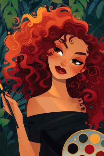 Art masterpiece, avatar for social networks of a manicurist woman beautiful with red curly hair, holding varnishes and a palette of varnishes in his hands, cartoon style, 8k --v 6.0 --ar 2:3