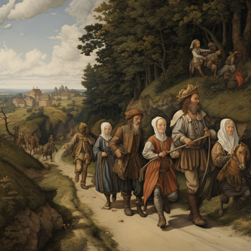 a group of medieval travelers walking along a country road, in the style of Ludwig Emil Grimm