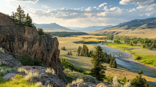 extra wide digital photo of the lower canyon of Makoshika Stake Park, Montana including the Yellowstone River taken from a scenic overlook on the upper section of the Park spectacular view professional color grading ultrarealistic detail style raw H6D --ar 16:9 --v 6.1