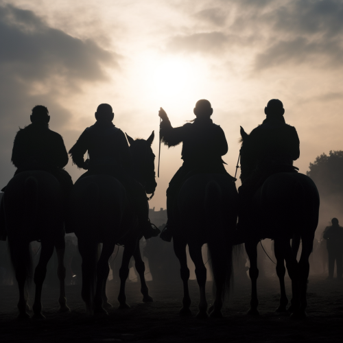 silhouettes of FOUR knights in horses, standing at the edge, looking at the crowd of people cheering below them, in a vast, dark, sunrise environment --v 5.0 --s 750