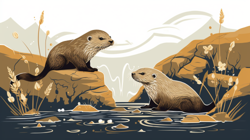 an illustrated logo in the style of Japanese ink art. A canyon in the southern appalachian mountians. Two otters play in the river at the bottom. uplifting. --ar 16:9